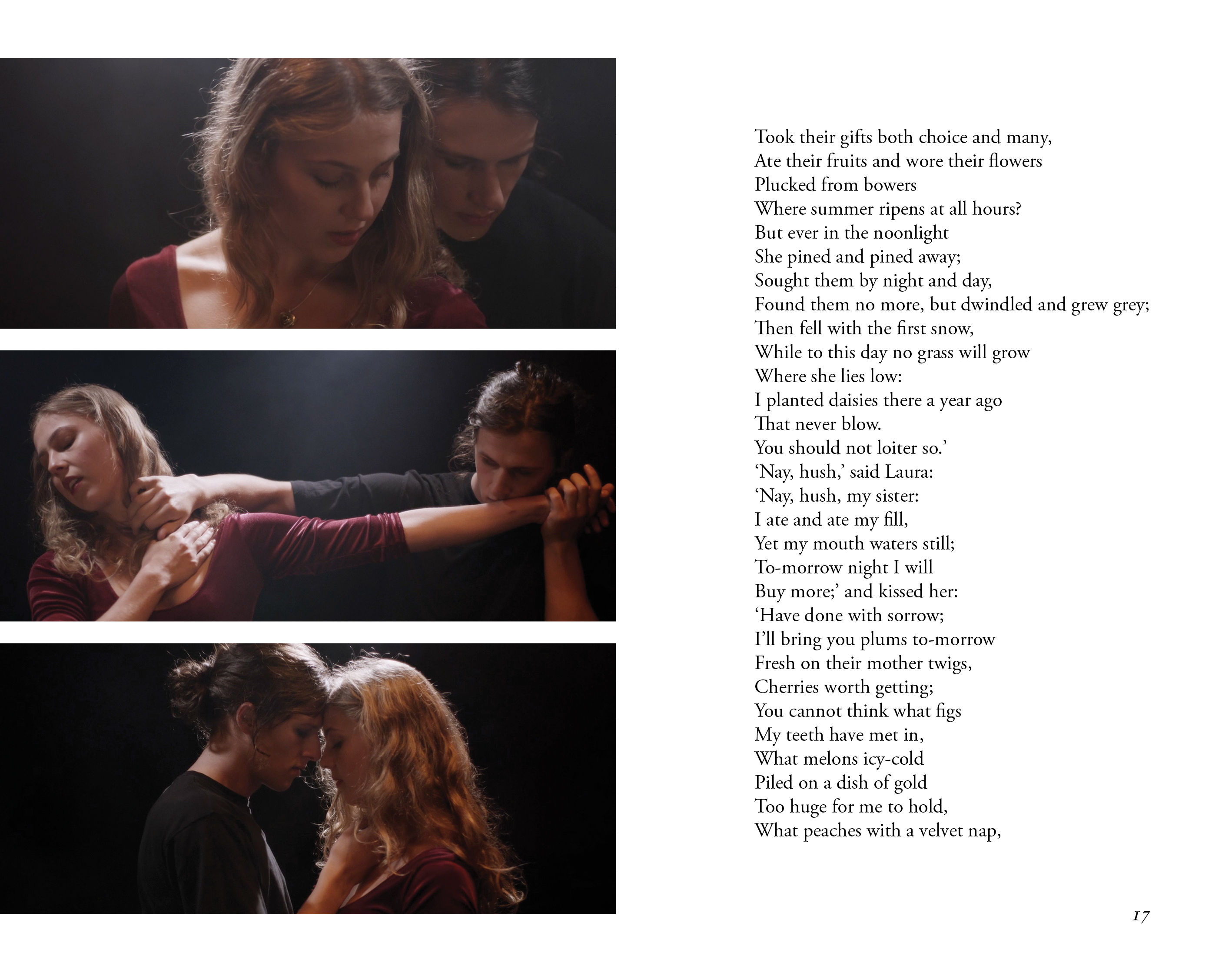 Lizzie is drawn into their bacchanal, discovering and fully embodying her own sensual power. Triumphant, she returns having won the fiery antidote to Laura’s poison, and then watches as she fits and writhes, not knowing whether it has saved or killed her. But the next morning, entangled, both women wake as from a dream – to begin anew.